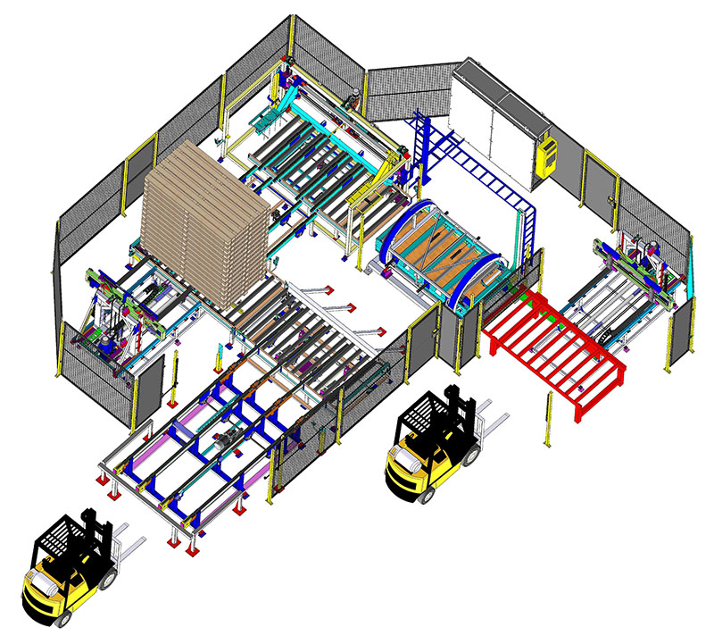Конвейерная система для палет работает по отлаженному алгоритму. На линию устанавливается стопка с неправильно сложенными поддонами, далее стопка, проходя через автоматическую линию выдаёт поштучно правильно перевёрнутые поддоны, и штабелируется обратно в стопку, которую можно использовать на основной линии.