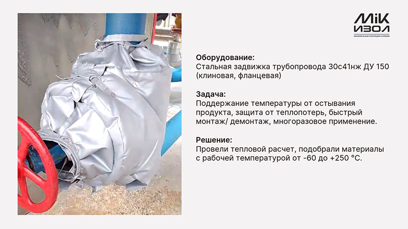 Термочехлы МИК-БСТИ – это съемные полносборные теплоизоляционные конструкции многоразового использования. Они предназначены для тепловой и звукоизоляции, а также огнезащиты трубопроводов и оборудования сложной геометрической формы, требующих периодического обслуживания.