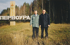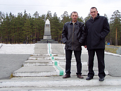 Поездка в г. Первоуральск на ПЗГО с президентом Павлом Драгоуном и его помощником Сергеем Василенко. Павлу хотелось увидеть здесь цех каменного литья, который был построен еще в давние советские времена, и являющийся единственным в нашей стране. Его мечта сбылась. Путешествие состоялось после 2-го Всероссийского отраслевого совещания производителей минераловатной продукции «Техническое регулирование в минераловатной отрасли и проблемы рынка теплоизоляционных материалов», в котором Павел и Сергей принимали участие (совещание проходило 16–17 октября 2003 г. в Пермском государственном техническом университете). Ездили в Первоуральск на автомобиле 20 октября 2003 г., на одной из фотографий стоим с Сергеем у географического знака «Европа – Азия» в Свердловской области.