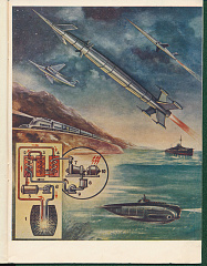 Этот сюжетный рисунок является иллюстрацией к статье «Атомные двигатели» (Р.Г. Перельман, кандидат технических наук), напечатанной в журнале «Наука и жизнь» №1 за 1956 год. Вот его описание: «Атомные двигатели найдут широкое применение для транспортных средств на суше, на море, в воздухе и космическом пространстве. На вкладке внизу – один из возможных вариантов атомной силовой установки (АСУ): 1. Реактор. 2. Подогреватель. 3. Парообразователь. 4. Перегреватель. 5 Компенсационный бак. 6. Насос контура теплоносителя. 7. Паровая турбина. 8. Конденсатор пара. 9. Насос контура рабочего тела. 10. Электрогенератор, вырабатывающий ток для питания электродвигателей».