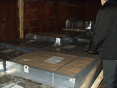 Первая поставка изделий из плавленого базальта в Россию с Первый исторический вагон. Его досмотр в Пермской таможне 01.03.2004 г. и выгрузка на наш склад 05.03.2004 г. Все фотографии (9 шт.) смотрите, пожалуйста, здесь: Базальтовое литье было завезено в большом ассортименте. Предназначалось оно для рекламных целей, популяризации материала в нашей стране, для раздачи всем желающим. Его первая публичная демонстрация произошла на