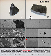 На 4-м коллаже: В двух столбиках слева – электронно-микроскопические снимки образца базальта (а), взятого на карьере EUTIT s.r.o. (Чешская Республика) . В двух столбиках справа – электронно-микроскопические снимки плитки из плавленого базальта EUTIT s.r.o. (б). Разница в микроструктуре между природным камнем-базальтом и его переплавленным аналогом существенна (см., например, снимки при 1000-кратном увеличении, отмеченные красными кружочками).