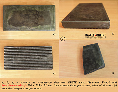 На 1-м коллаже: а, б, в, – плитка из плавленого базальта EUTIT s.r.o. (Чешская Республика) ; 250 х 125 х 23 мм. Эта плитка была расколота, один её обломок (г) взят для макро- и микросъёмки.