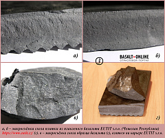 На 3-м коллаже: а, б – макросъёмка скола плитки из плавленого базальта EUTIT s.r.o. (Чешская Республика) (г). в – макросъёмка скола образца базальта (г), взятого на карьере EUTIT s.r.o.
