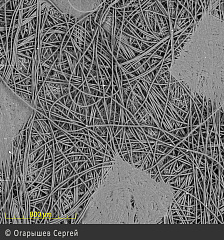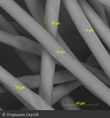 Позавчера купил в г. Перми в аптеке санитарно-гигиеническую маску и разрезал ее, чтобы посмотреть, что она из себя представляет внутри. Два слоя фильтрующего волокнистого материала. Очень тонкие. На электронном микроскопе сделали снимок волокон. Основную массу составляют волокна диаметром более 10 микрон. На одной из фотографий нанесен размер на волокно диаметром 1 микрон. Это самые тонкие волокна. Размер коронавируса – 100–120 нанометров, т.е. в десять раз меньше волокна диаметром 1 микрон. Если нанести на фотографию точку размером 1/10 микрона, то ее будет трудно отыскать глазами, потому что она будет очень маленькая. Иными словами, для коронавируса такой фильтр – открытый космос, он пролетит через него беспрепятственно.